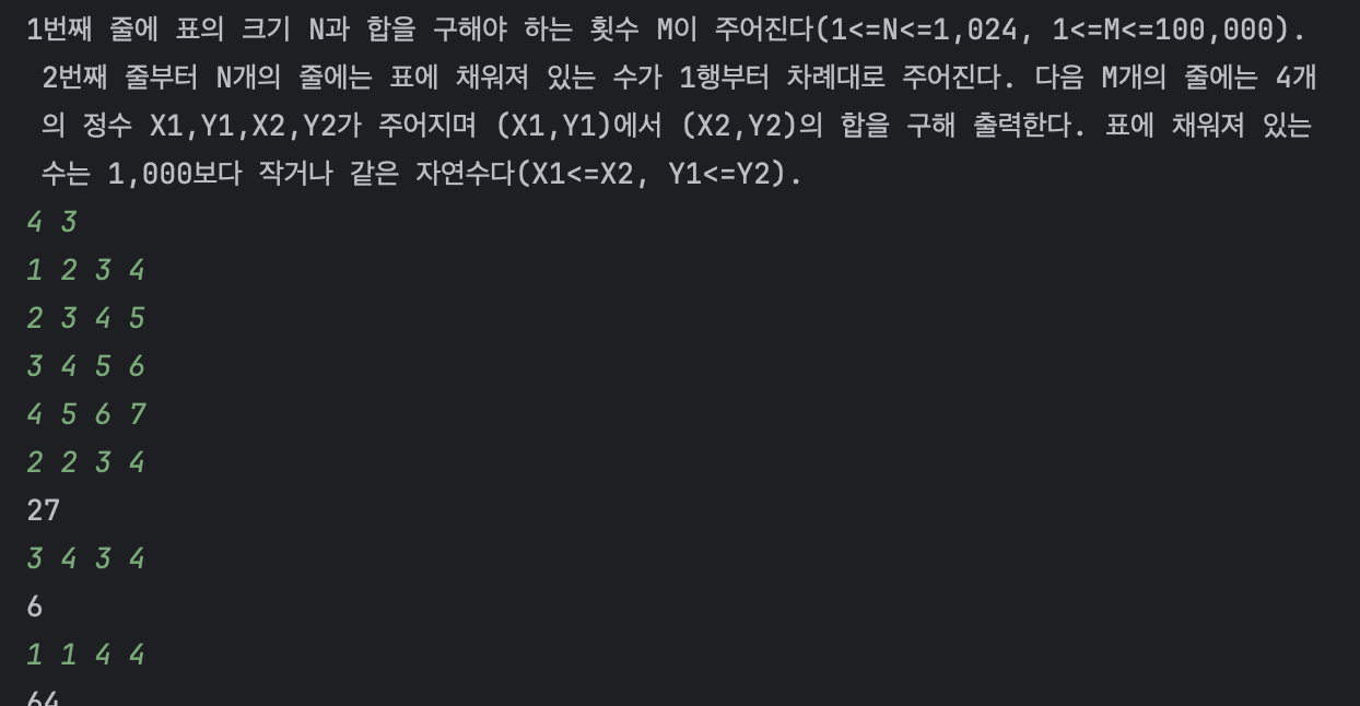 1번째 줄에 표의 크기 N과 합을 구해야 하는 횟수 M이 주어진다(1<=N<=1,024, 1<=M<=100,000).