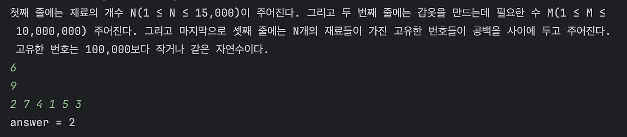 두 번째 줄에는 갑옷을 만드는데 필요한 수 M(1 ≤ M ≤ 10,000,000) 주어진다.